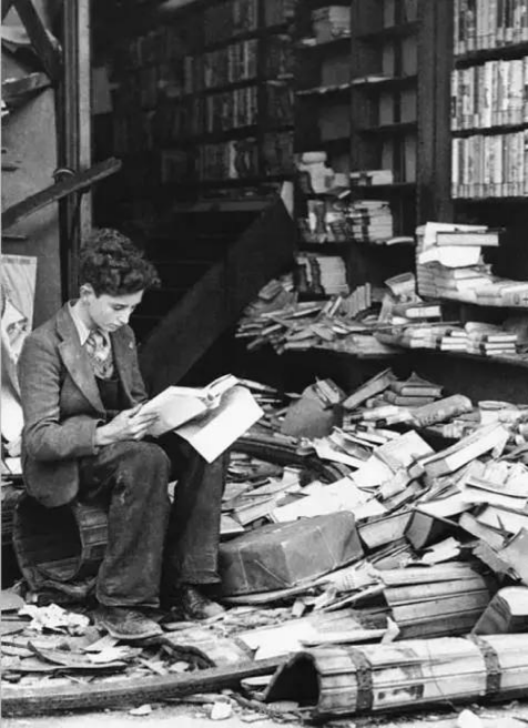 被炸毀的書(shū)店里,書(shū)籍散落了一地,一片狼藉里,一個(gè)少年正坐在那安安靜靜地看著一本書(shū)。
