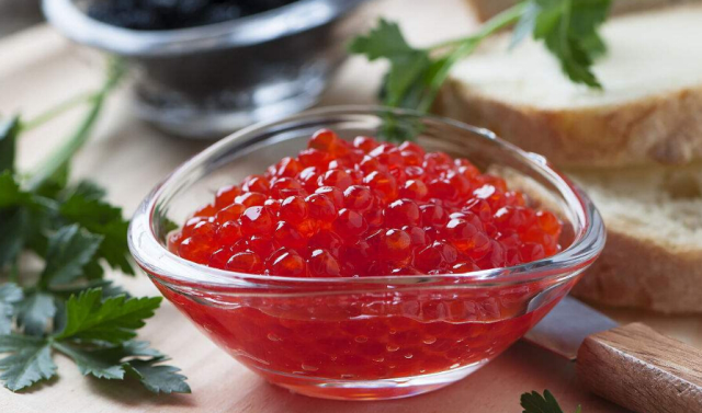 原料取自里海的鯨魚,嚴(yán)格說,只有用鯨魚卵制成的醬才能叫魚子醬。魚子醬是俄羅斯的頂級(jí)美食,其尊貴程度甚至要超越中餐里的鮑魚。魚子醬分為紅魚子醬和黑魚子醬兩種,黑色的產(chǎn)于鱘魚,紅色的產(chǎn)于鮭魚。