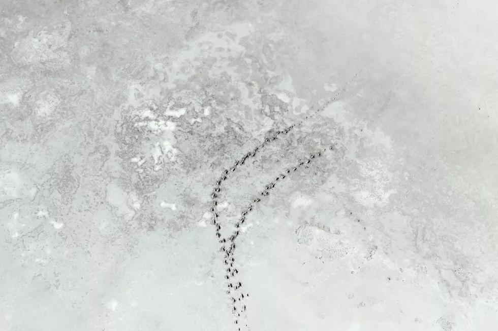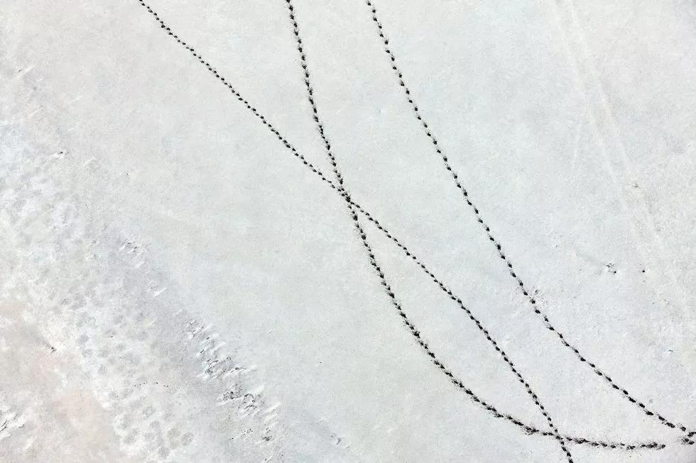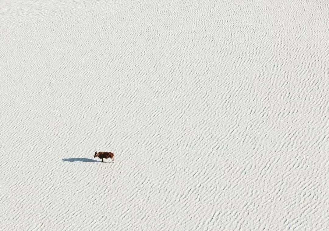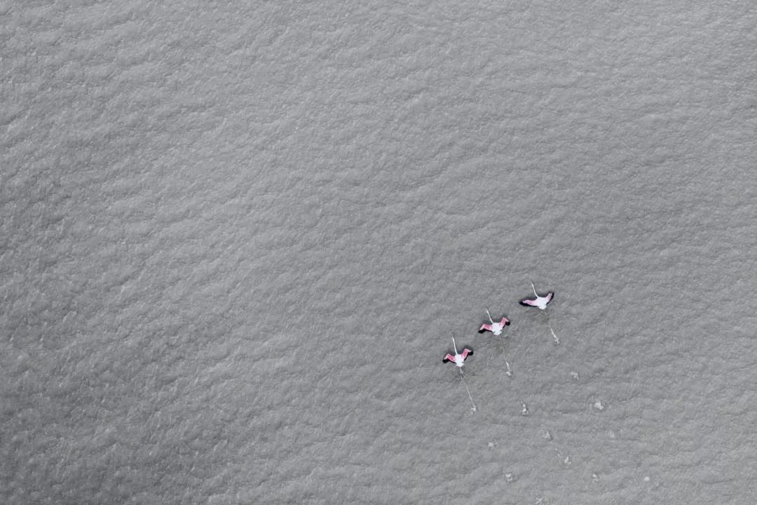 如火烈鳥、好望角大羚羊、甚至是一只在蔚藍(lán)的海水中休息的烏龜。動(dòng)物們行進(jìn)時(shí)留下的痕跡和陰影都是他作品中重要的組成元素。