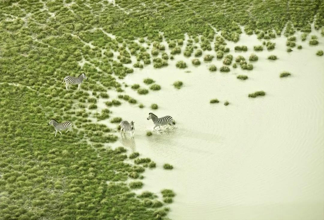 而鹽沼周圍,草木生長(zhǎng),海藻般的青綠色覆蓋了大部分的鹽池區(qū)域。成千上萬(wàn)只粉紅色火烈鳥與斑馬群、公牛群和鬣狗在這里共同生活著。