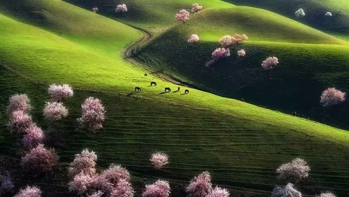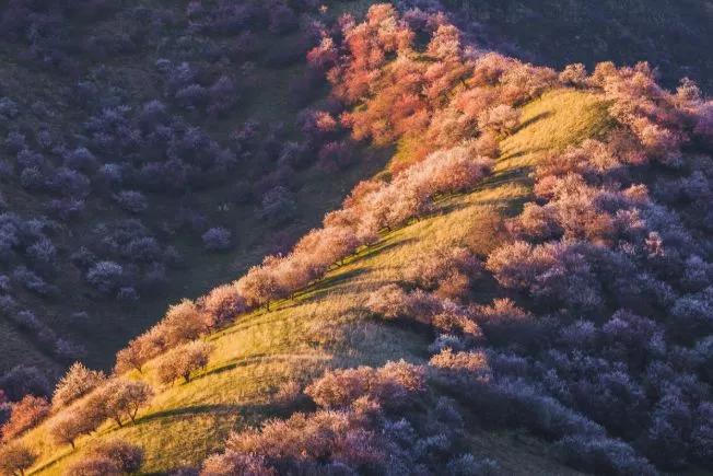 杏花溝山坡起伏,線條優(yōu)美,每到春暖花開之際,隱藏在伊犁河谷深處的野杏林便變身人間仙境,完勝三生三世十里桃花。