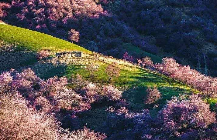 4月初,這里就變身杏花海洋,每個山巒都點綴著開滿了花朵的野樹林。