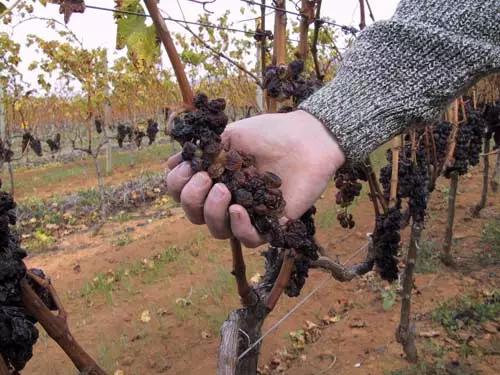 你以為這些真菌會(huì)轉(zhuǎn)化成貴腐菌嘛,too young!只有氣候極其合適的時(shí)候這些真菌才會(huì)發(fā)展成貴腐菌,大部分時(shí)候它們只配叫灰霉,能做的所有事情就是搞爛你的葡萄。趕上秋雨連綿的時(shí)候,大規(guī)模爆發(fā)的真菌侵染簡(jiǎn)直是“車禍現(xiàn)場(chǎng)”。