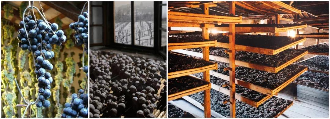 Appassimento,中文譯名枯藤法,是在采收后把成熟健康的葡萄放入風(fēng)干房,采用Ploto*、 Arele*、Uva Appesa*等方式松散的放置,風(fēng)干時(shí)間大致在90-120天。