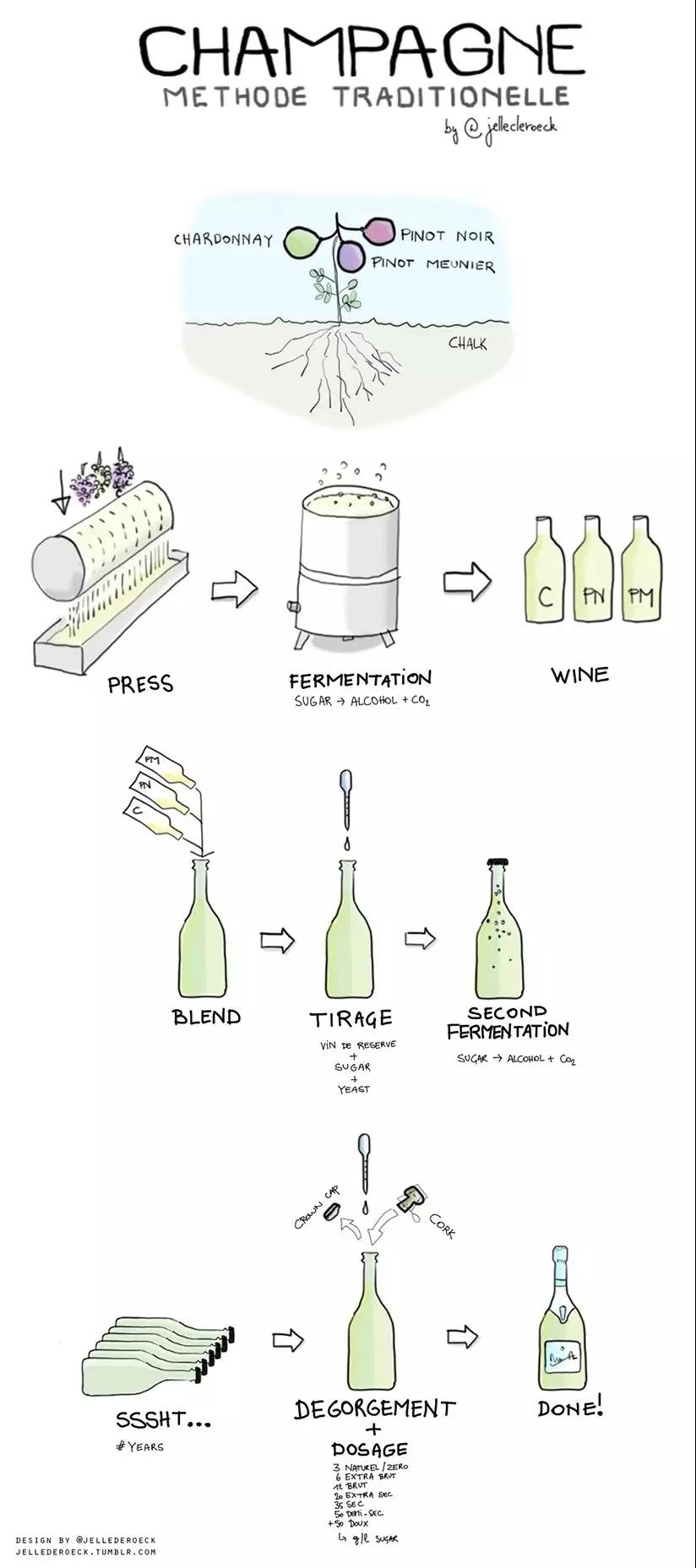 不同于靜止葡萄酒的一步到位,不管是使用傳統(tǒng)法轉(zhuǎn)移法或是罐中發(fā)酵法,起泡酒(包括香檳、Cava、Prosecco等一系列非人工加氣起泡酒)的釀造都需要經(jīng)歷一個(gè)二次發(fā)酵的過(guò)程。