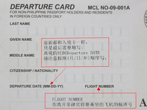中國公民在結(jié)束菲律賓觀光旅游,于機(jī)場辦理出境登機(jī)手續(xù)前,應(yīng)先交納機(jī)場稅,然后到訂購返機(jī)票的航空公司柜臺前辦理出境登機(jī)手續(xù),領(lǐng)取登機(jī)卡和行李卡,同時向航空公司工作人員遞交出境卡。出境卡的填寫內(nèi)容同入境卡基本相同。