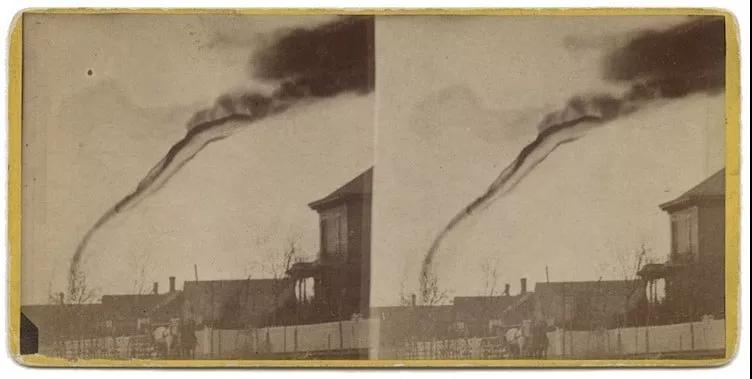目前最早可知的龍卷風(fēng)照片是在美國堪薩斯州拍到的。1884 年4 月26 日,一陣龍卷風(fēng)緩慢地刮過堪薩斯州的安德森縣,這給了業(yè)余攝影師A.A. 亞當(dāng)斯(A.A. Adams)設(shè)置他箱式相機(jī)的機(jī)會(huì)和時(shí)間。