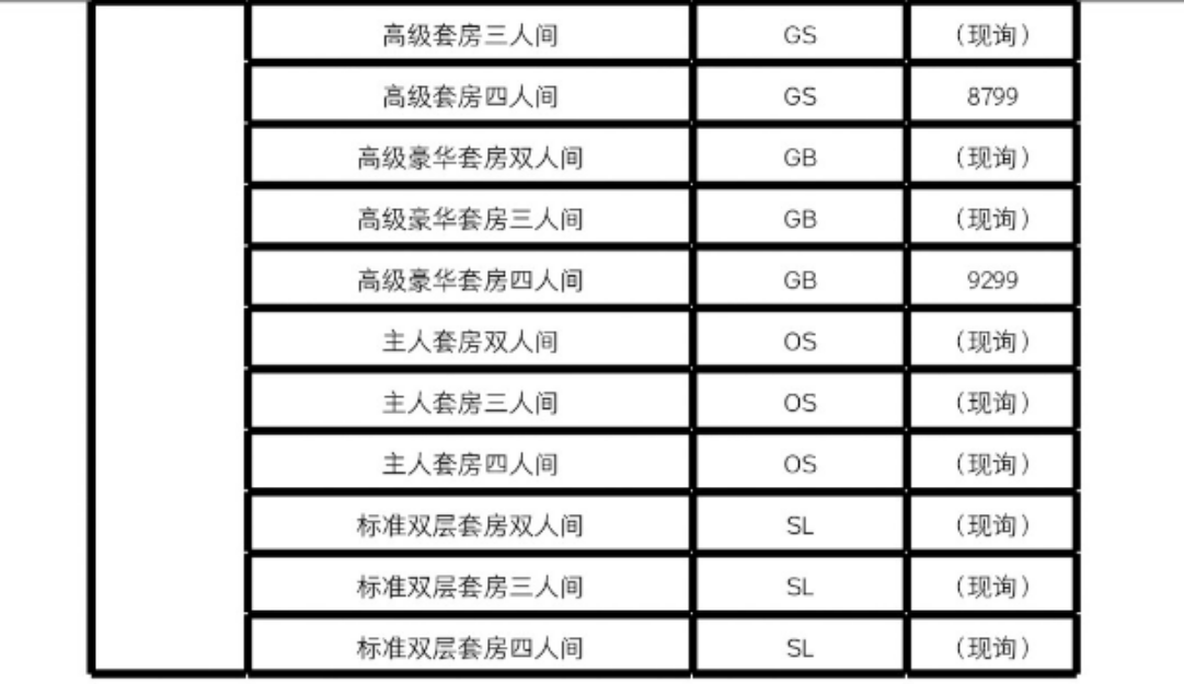 1、艙位價格詳情: