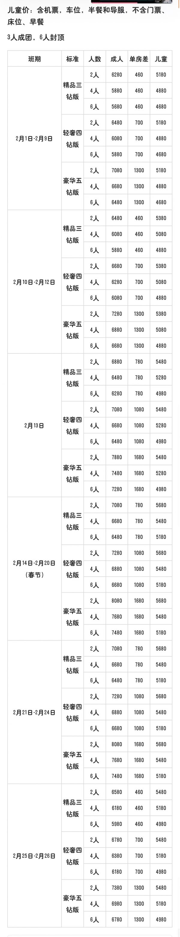 成人 ¥7480 /人, 兒童 ¥5680 /人