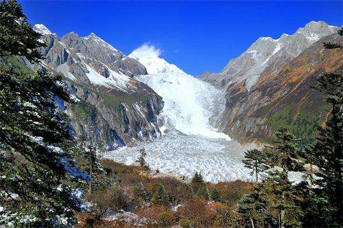 晶瑩的現(xiàn)代冰川從高峻的山谷鋪瀉而下;
