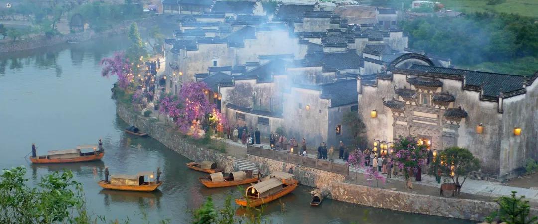 兩岸青山,青翠碧綠,形狀各異,江邊古色古香的徽州人家藏匿于青山中,粉墻黛瓦,煙霧裊裊。