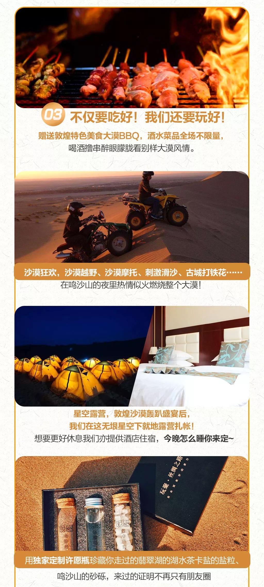 晚上在敦煌來一場絕無僅有的沙漠轟趴盛宴,沙漠越野、沙漠摩托、刺激滑沙、古城打鐵花……花樣玩法,玩累了咱們就坐地品嘗特別贈送的沙漠BBQ,酒水菜品全場不限量,大家圍繞著篝火舞蹈,聞著燒烤的炭火香,暢飲著啤酒,品嘗已然備好的燒烤,在鳴沙山的夜里熱情似火燃燒整個大漠!