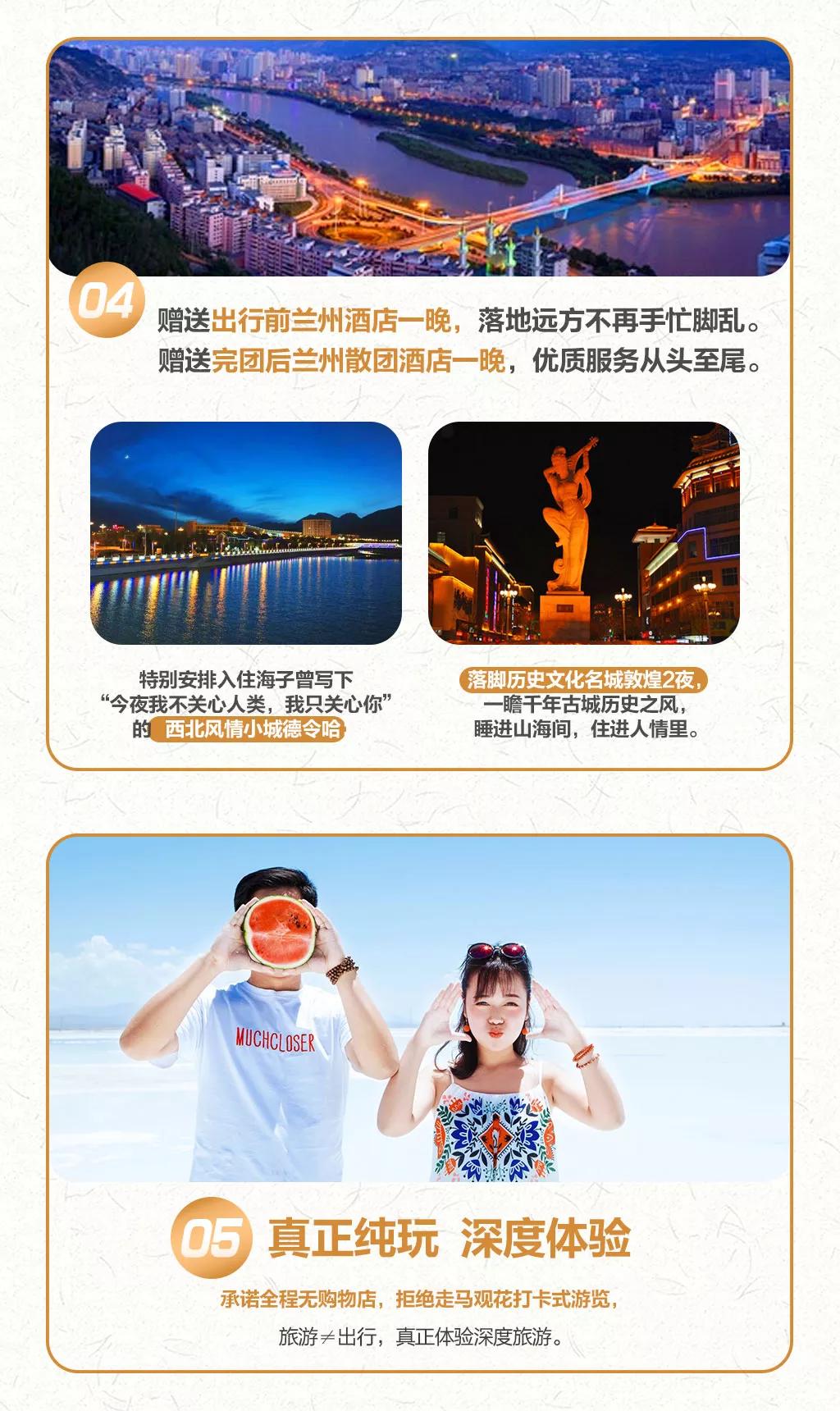 贈送:贈送特色敦煌沙漠BBQ;特贈獨家定制許愿瓶禮盒,許你獨家記憶;贈送貼心禮包旅游三寶、魔術頭巾、礦泉水;贈送蘭州市區(qū)接機/接火車服務,23點后由于運管規(guī)定不能接機/接站,敬請諒解。(贈送項目不用費用不退)