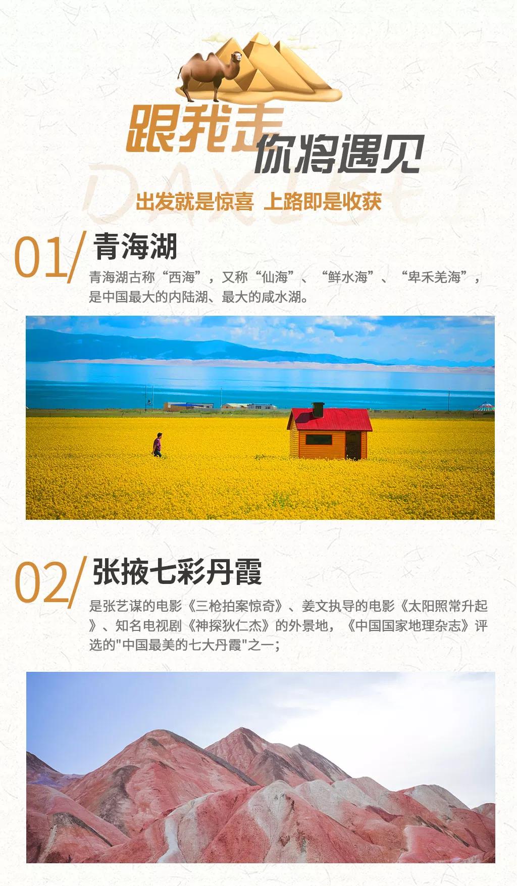 門票:莫高窟門票、張掖丹霞門票(含觀光車)、嘉峪關門票、鳴沙山門票、石油小鎮(zhèn)門票、茶卡鹽湖門票、青海湖二郎劍景區(qū)門票。(莫高窟普通門票構成:門票180元/人+交通費10元人+莫高窟數字展示中心48元/人;莫高窟應急票構成:門票90元/人+交通費10元/人)