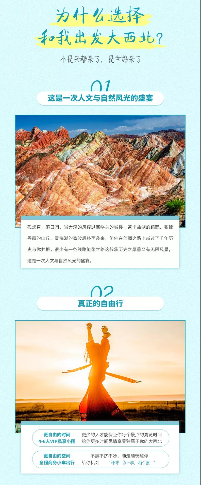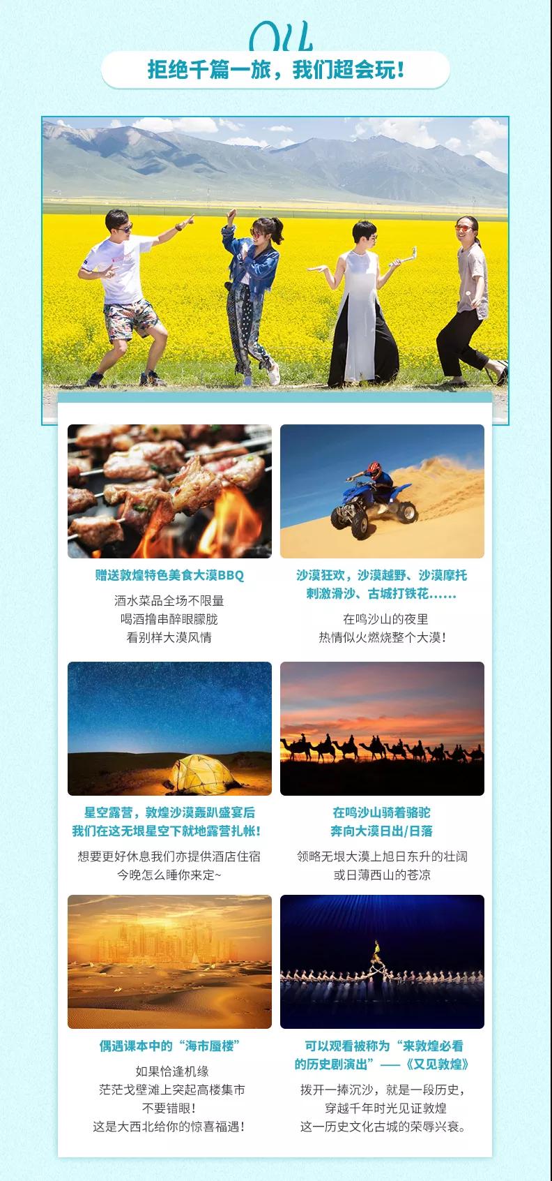 溫馨提示:西北地區(qū)天氣干燥,旅途的過程中請(qǐng)大家多喝水,注意防曬;敦煌《又見敦煌》演出,旅游淡季298元/人,旺季368元/人起;果木烤全羊費(fèi)用根據(jù)羊的大小決定,由參與活動(dòng)的游客均攤,一般10人一桌,人均消費(fèi)160元左右。
