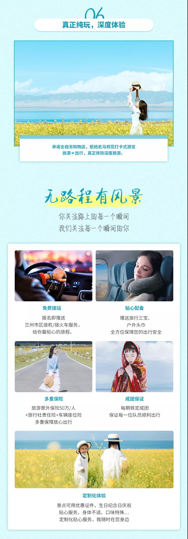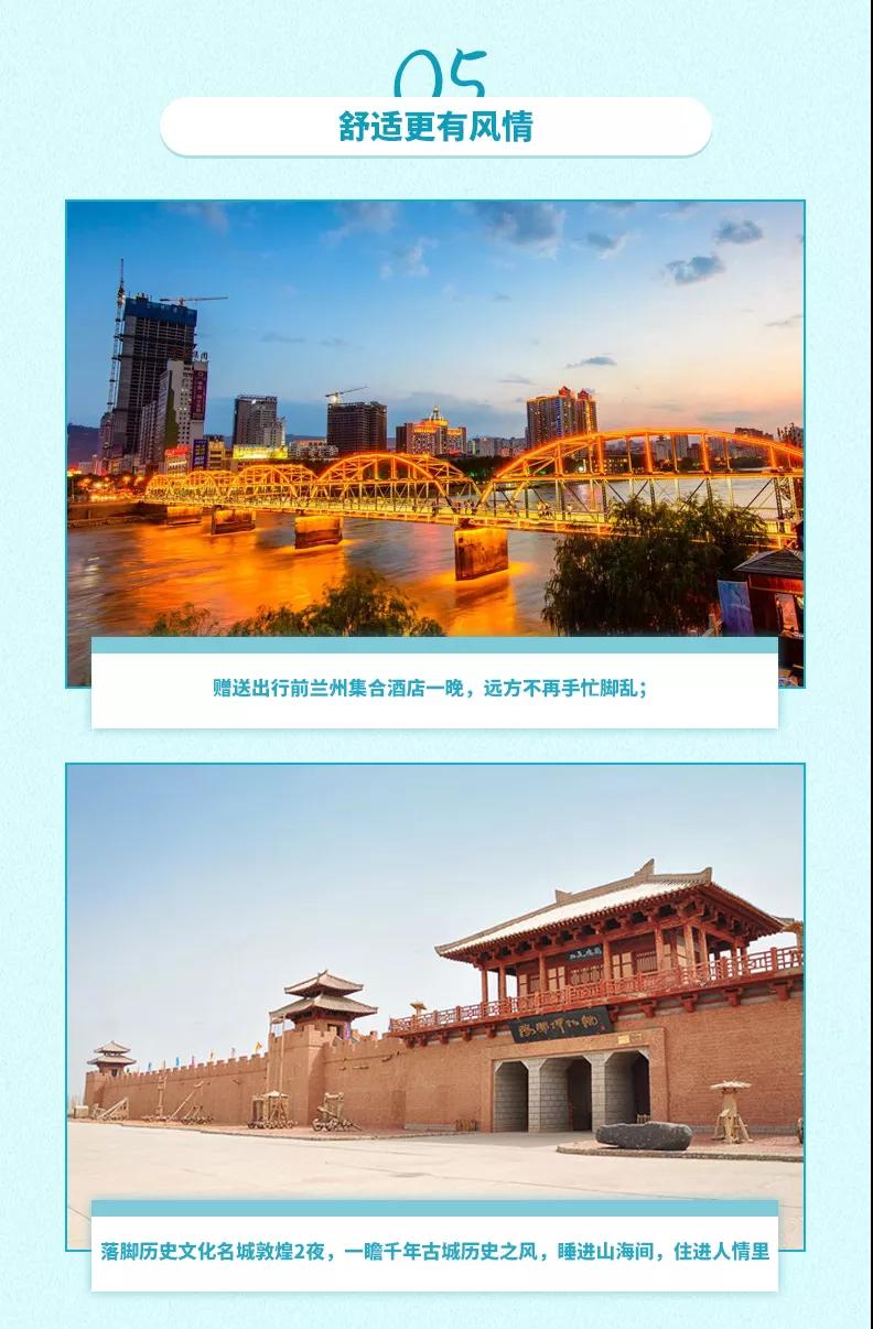 7、贈(zèng)送:贈(zèng)送特色敦煌沙漠BBQ;贈(zèng)送貼心禮包旅游三寶、魔術(shù)頭巾;贈(zèng)送蘭州市區(qū)接機(jī)/接火車服務(wù),23點(diǎn)后由于運(yùn)管規(guī)定不能接機(jī)/接站,敬請(qǐng)諒解。(贈(zèng)送項(xiàng)目不用費(fèi)用不退)
