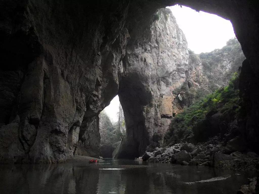 在這一段長約2公里的六沖河河道上,箱形切割頂板 多處塌陷,形成了多個形狀、大小各異的天窗、天坑,是已發(fā)現(xiàn)的天窗天坑最密集的溶洞群,是可供乘船游覽最高大的溶洞群。