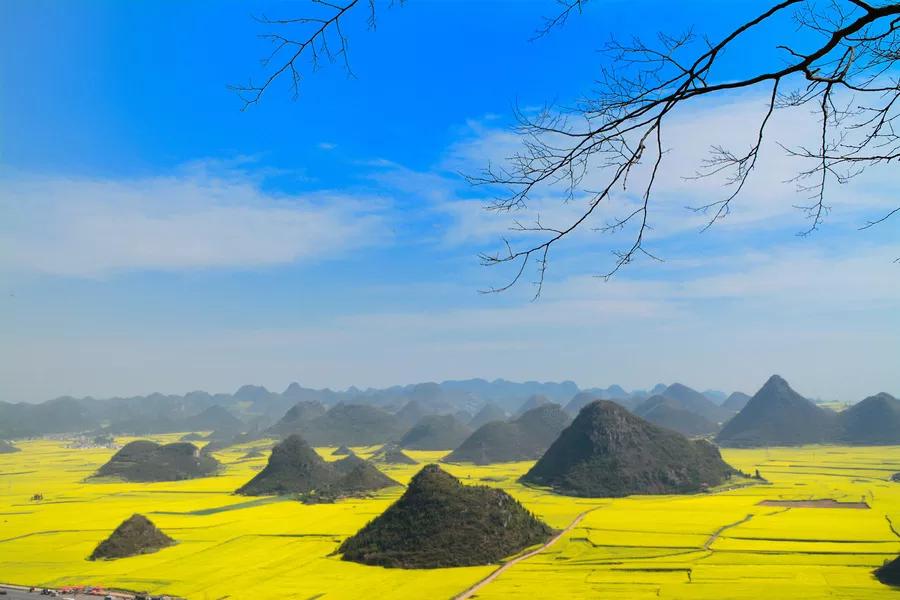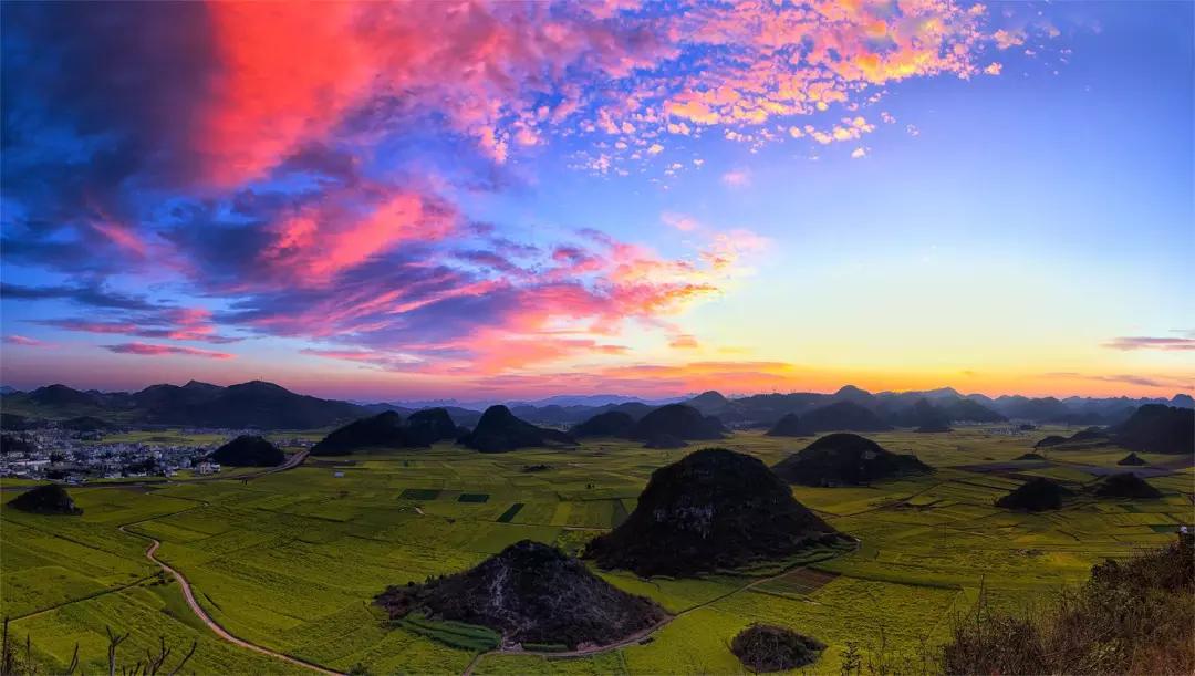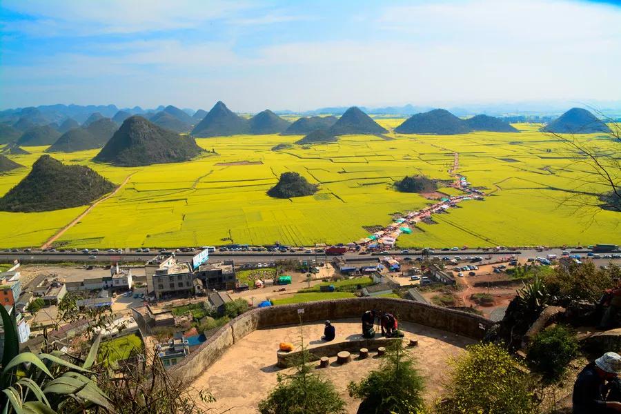 金雞峰在羅平縣城東北方,從羅平縣城沿324國道北東行12公里,有一處數(shù)不勝數(shù)的錐狀的小山叢,錯落有致地排列在壩子里,這就是金雞峰叢。金雞峰是拍攝羅平菜花大景的主要地點之一,在日出和日落時可以拍到非常漂亮的片片。