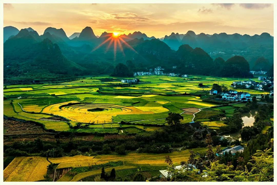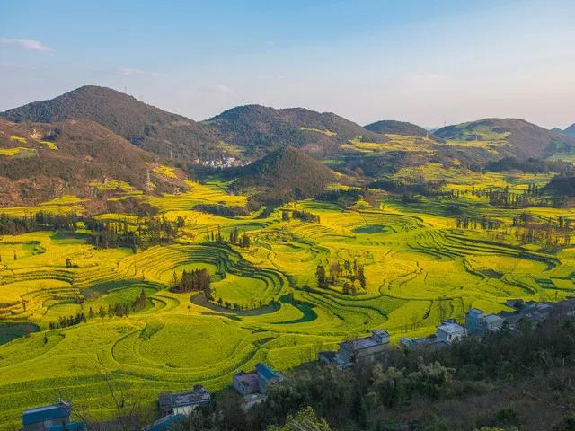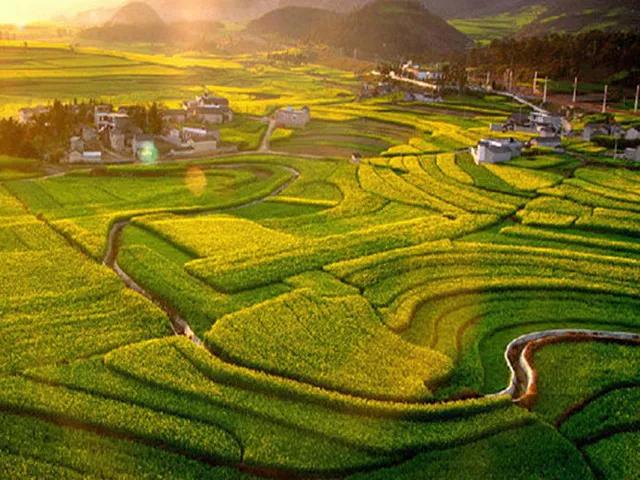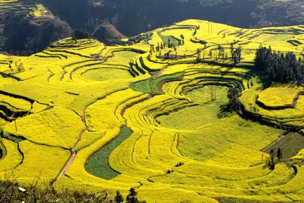 冬春季節(jié),長滿油菜花的地塊金光燦爛,長著小麥的地塊碧綠如玉;通過時候,沿著園周梯田一圈圈往上延伸的多是開滿油菜花的,像無數(shù)金龍盤臥。還有的弓形、半園形的梯田,多的十幾級、少的三四級,而且各種形狀相鑲,其間隔有一兩塊裝滿水的閑田如明鏡置于其中,一排排翠綠的樹點綴,形成了色彩鮮明、線條優(yōu)美、奇妙無比的美景。