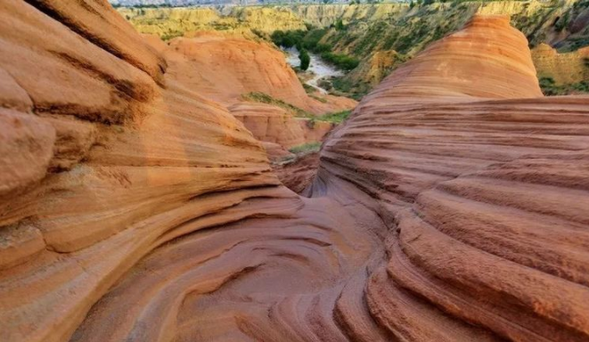 波浪谷展示的是由數(shù)百萬年的風(fēng)、水和時(shí)間雕琢砂巖而成的奇妙世界。層層疊疊的石頭就像一大批鋪蓋在地面上浸染過后晾曬的紅色布匹,一層層、一卷卷、一盤盤在夕陽的渲染之下,異常的鮮紅; 與溝底一處處流淌細(xì)小的河水和遠(yuǎn)處覆滿綠色植被山頂上轉(zhuǎn)動(dòng)的風(fēng)車構(gòu)成了一幅優(yōu)美的實(shí)景畫。