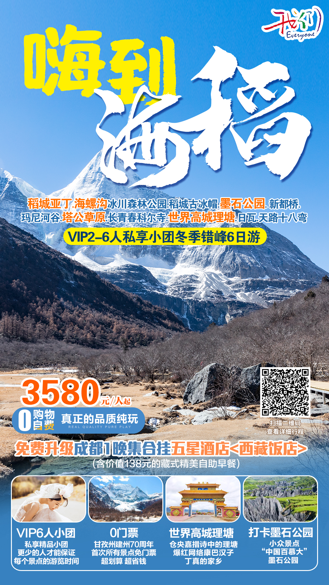 稻城亞丁.海螺溝.墨石公園.世界高城理塘.新都橋.瑪尼河谷.塔公草原 VIP2-6人私享小團(tuán)五晚六天