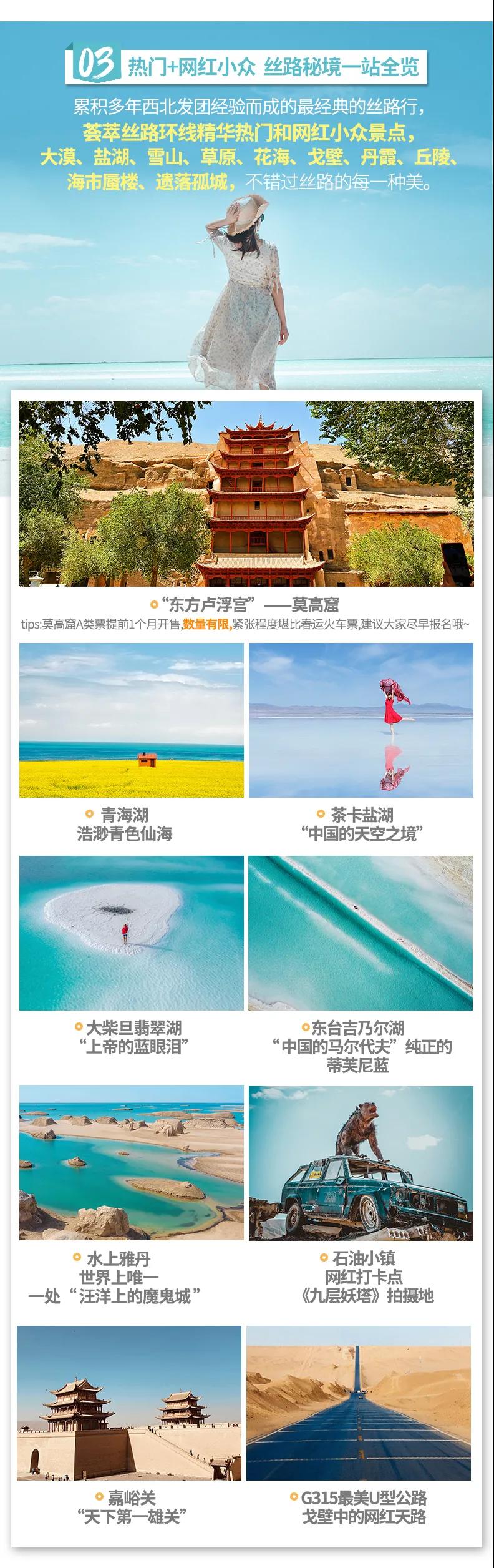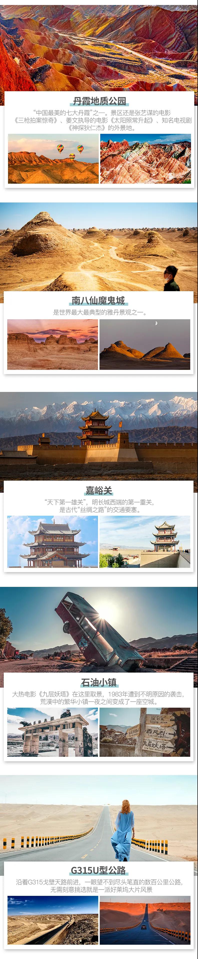 青海湖+敦煌莫高窟+茶卡鹽湖+東臺吉乃爾湖+九層妖塔+祁連草原+嘉峪關(guān)+南八仙魔鬼城+大柴旦翡翠湖+鳴沙山月牙泉+水上雅丹+張掖丹霞+G315U形公路+崗什卡雪峰