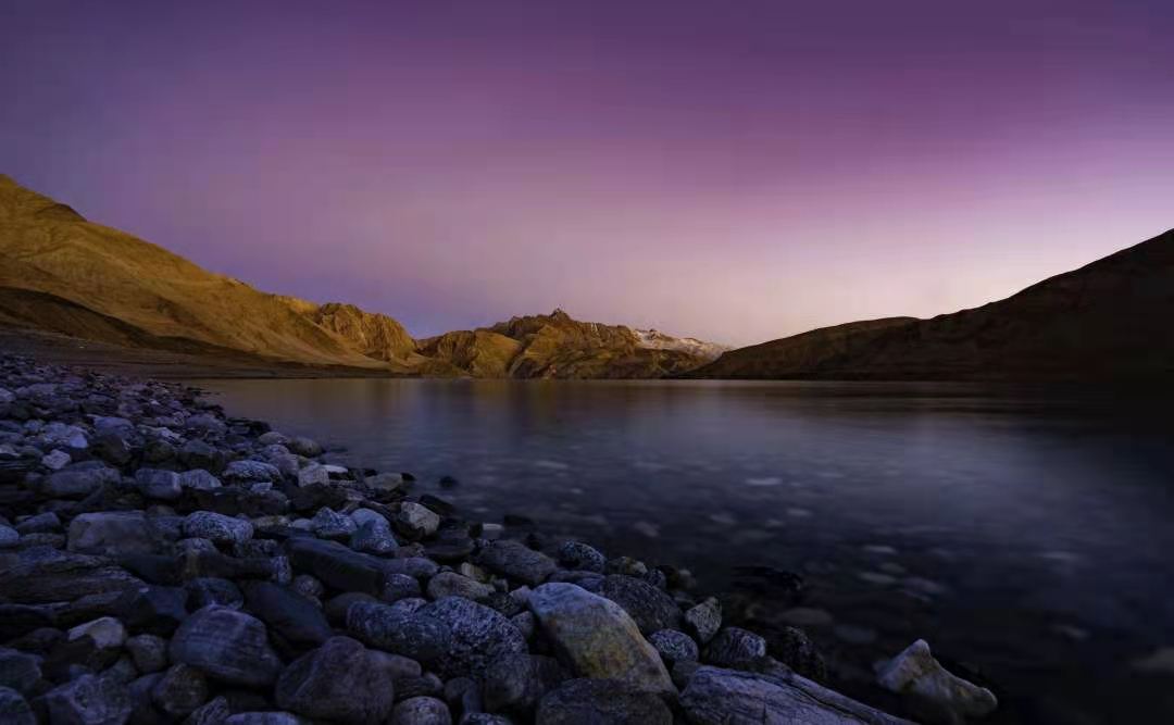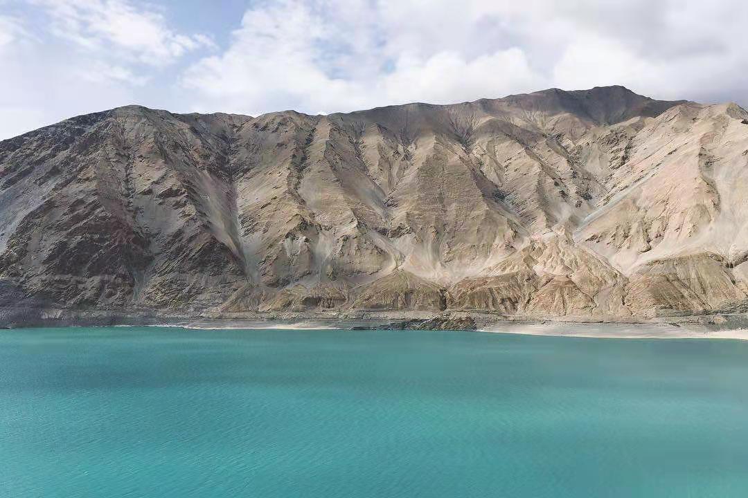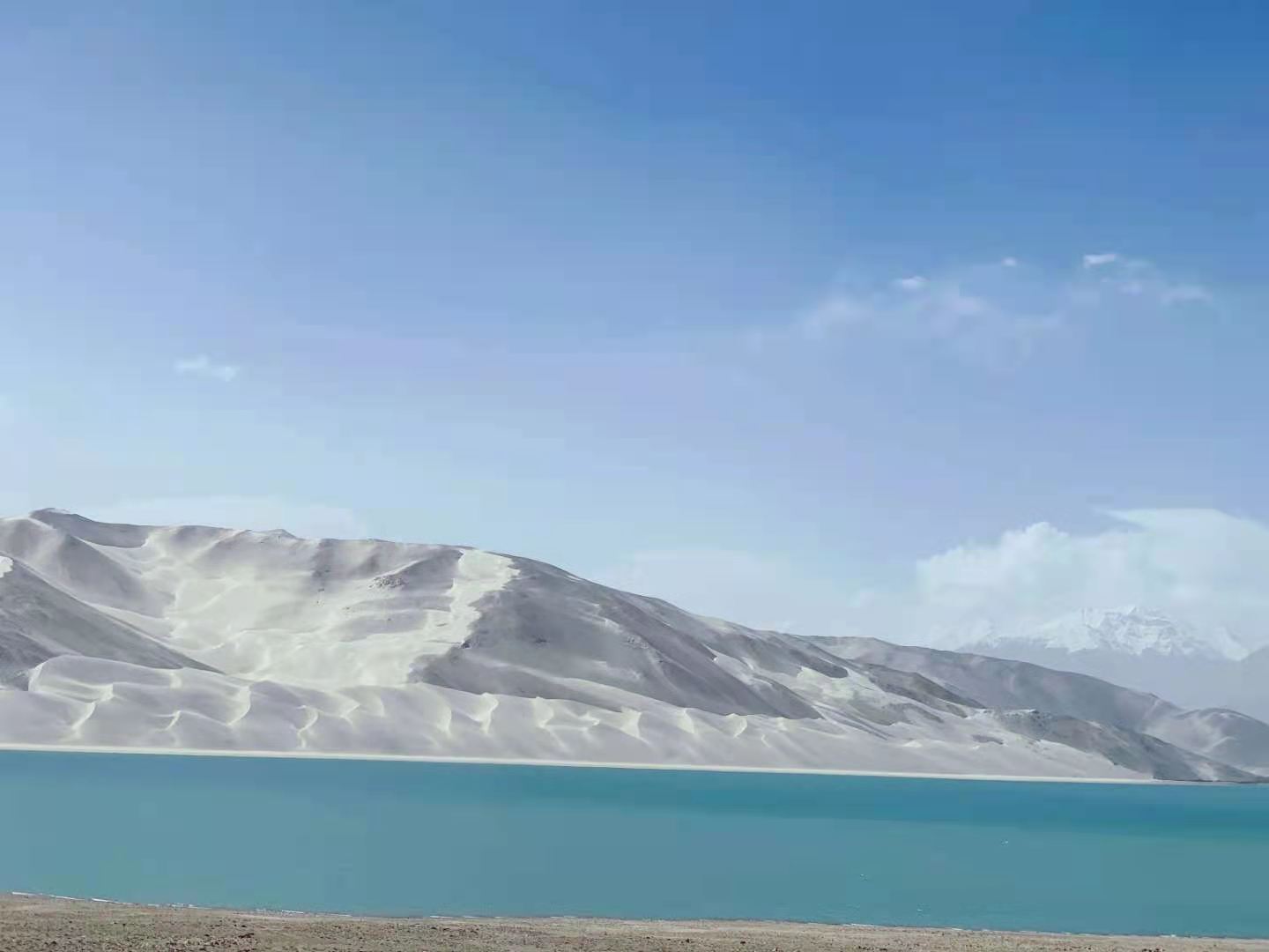 車(chē)子行進(jìn)在海拔三千多米的【蓋孜峽谷】中。喀喇昆侖公路像一條玉帶,沿著蓋孜河在蓋孜峽谷中穿梭著,眼前的景色又變成了綿延不絕的荒山雪嶺。此時(shí)突然出現(xiàn)的美麗湖泊便是【布倫口白沙湖】湖水在帕米爾高原潔靜的陽(yáng)光下,閃耀著金屬般的光澤。湖水在天空、白沙和雪山的綜合作用下呈現(xiàn)出一種別樣的藍(lán)。