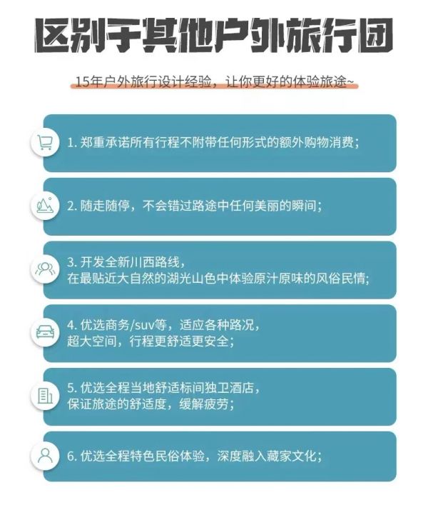 5、該線(xiàn)路為特種線(xiàn)路,當(dāng)?shù)鼐频昙安惋嫍l件無(wú)法與城市相比,請(qǐng)游客做好心理準(zhǔn)備;賓館內(nèi)無(wú)牙膏牙刷、拖鞋等一次性衛(wèi)生用品,請(qǐng)自備個(gè)人衛(wèi)生用品;沿途商店較少,民俗習(xí)慣亦有不同,游客可自備咸菜、小吃、干糧等零食,以備不時(shí)之需。