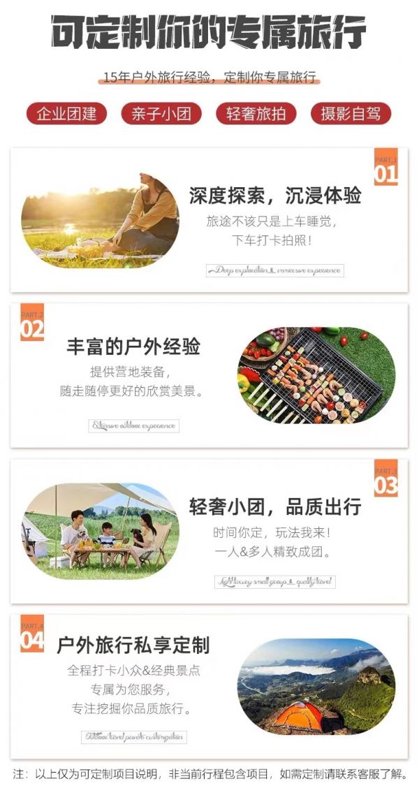 私人訂制:我們業(yè)務(wù)范圍囊括了全國(guó)各大城市,川西、西北、新疆、西藏,在路上永遠(yuǎn)有我們的身影。我們將為每一個(gè)有定制需求的你策劃出獨(dú)屬于自己的完美旅行。