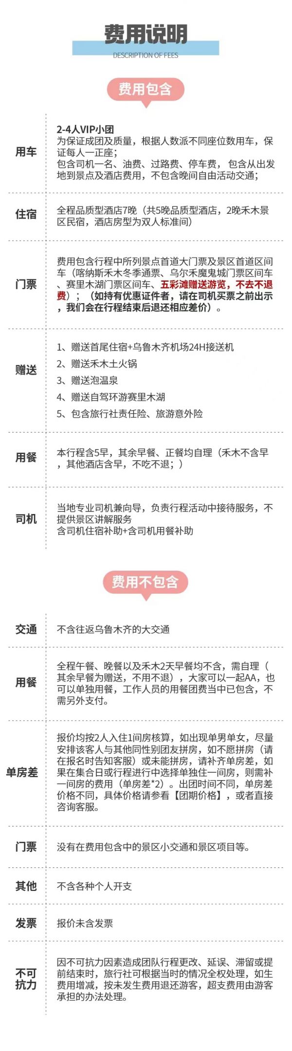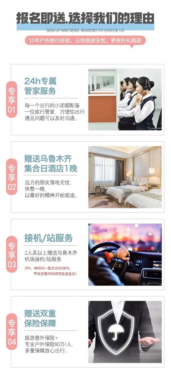 接站服務(wù):本次活動(dòng)提供烏魯木齊24小時(shí)接機(jī)/接站服務(wù),工作人員會(huì)在您出發(fā)日期前一天21:30之前向您推送消息并與您聯(lián)系,如果超過時(shí)間沒有接到任何通知,請及時(shí)與報(bào)名處聯(lián)系。(接站等待時(shí)間一般為15-20分鐘,最長不超30分鐘,節(jié)假日拼單人數(shù)較多情況下客人等待時(shí)間可能會(huì)延長)。