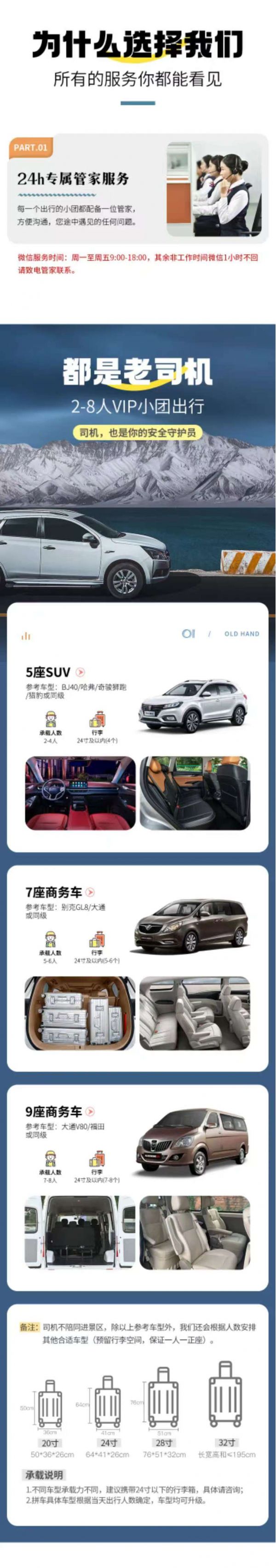 為保證成團(tuán)及質(zhì)量,根據(jù)人數(shù)派不同座位數(shù)用車,保證每人一正座;若遇資源緊張,會(huì)安排其他車型:包括但不限于5-7/9座或12-19座等正規(guī)旅游用車,車型均不接受指定,敬請(qǐng)諒解!