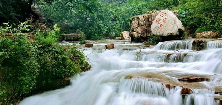石板流泉水清如境,一百余米的清泉,從石板上流過,兩旁懸崖對出,樹木蒼郁,太陽從樹蔭間照射石上,水波粼粼,閃光耀彩,在這里人們可做、可臥、可吟、可殤,大有王維明月松間照,清泉石上流的意境。