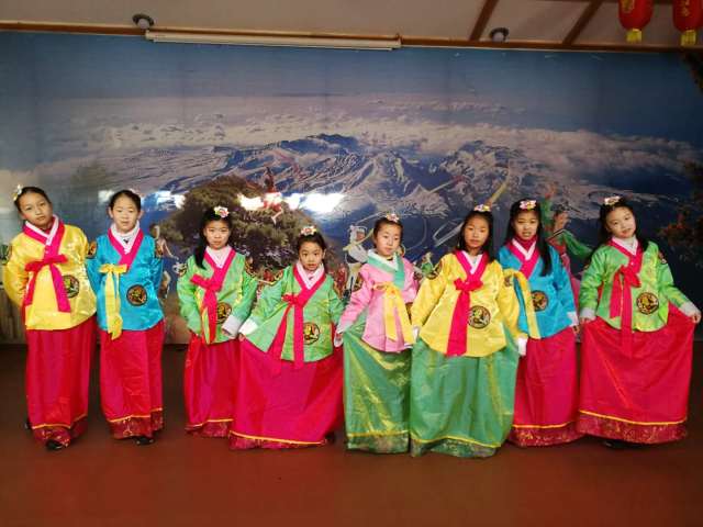 朝鮮族是一個能歌善舞的民族,象帽舞和腰鼓舞都是非常具有朝鮮風韻的舞蹈。男孩學習象帽舞,女孩學習腰鼓舞,最后秀一場我們自導自演的匯報演出。