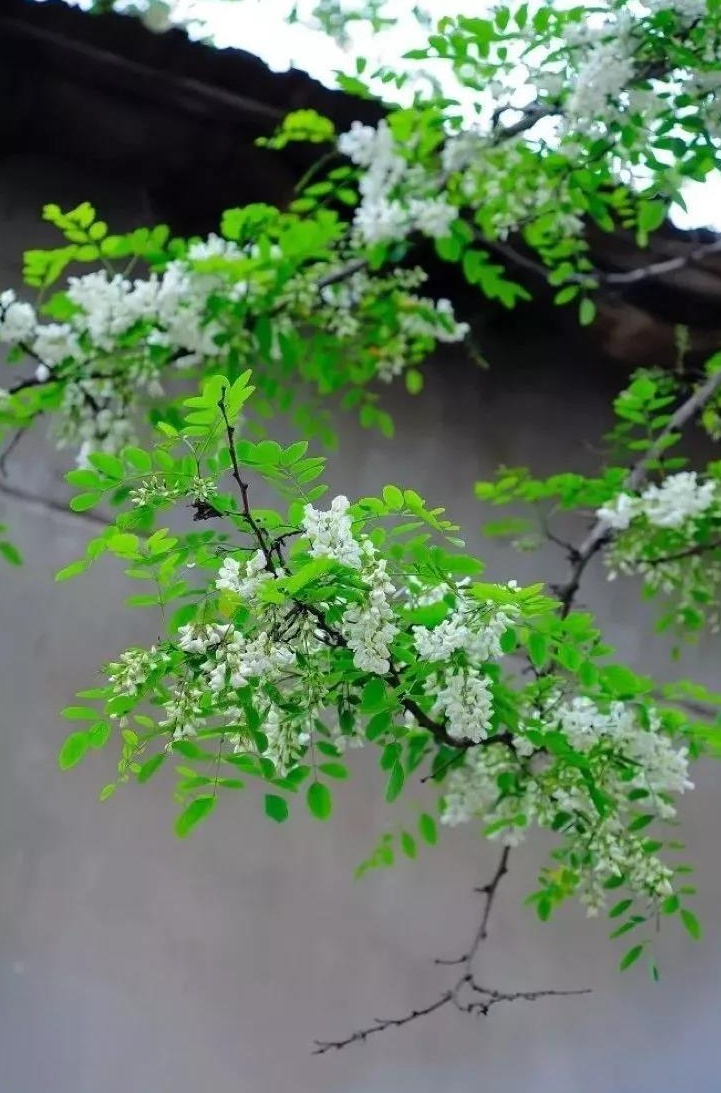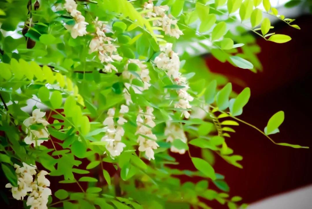 串串槐花懸于枝頭遠(yuǎn)遠(yuǎn)望去白花花的一片似白雪蓋樹(shù)