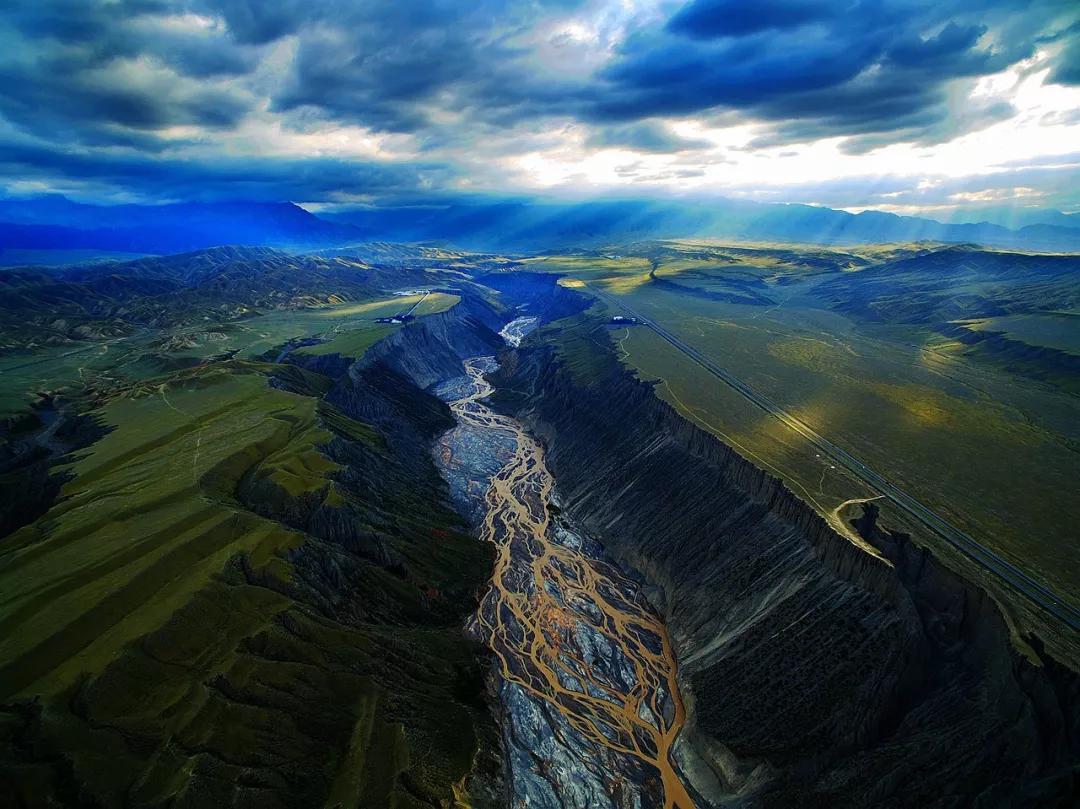從高空看,安集海峽谷的色彩異常豐富,河流切割大地,將不同顏色的巖層沖刷溶解,形成了一幅絢麗多彩的大地抽象畫景觀。與其他一些色彩灰冷單調(diào)的峽谷相比,擁有紅山、黛崖、青峰、綠島、碧水等豐富色彩的安集海峽谷,就像一條彩帶飛舞在天山北坡腳下,成為中國(guó)峽谷群中一條色彩最豐富的大峽谷。