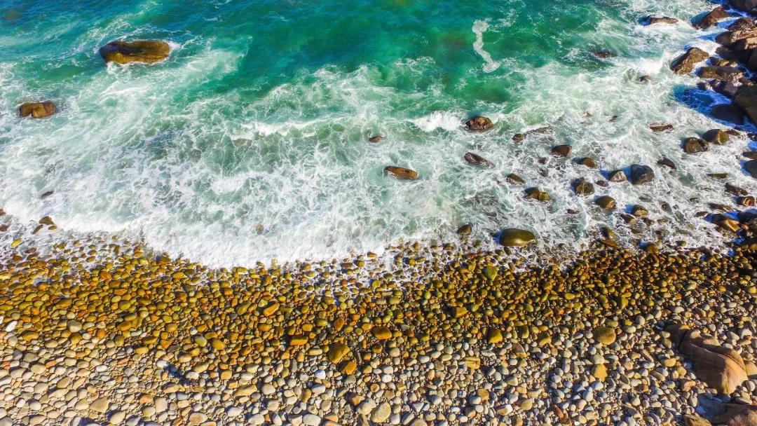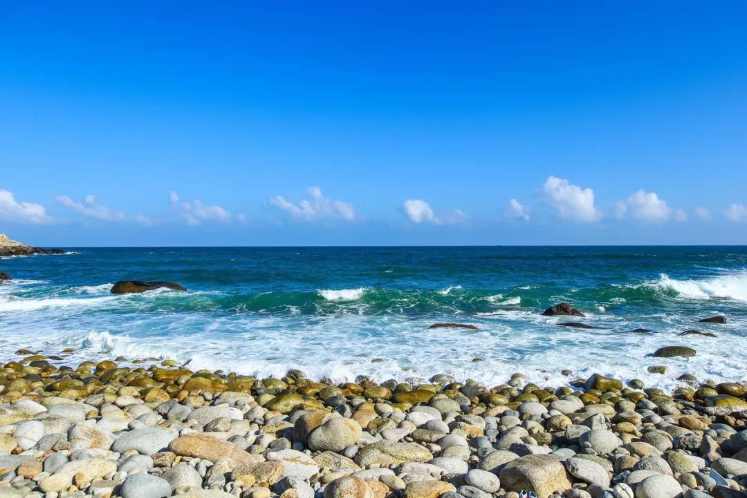 這里弓狀的數(shù)百米長(zhǎng)的海灘上,沒(méi)有潔白的沙帶,人臨此境,首先內(nèi)陸到湛藍(lán)的海水,再是密密麻麻的卵石。