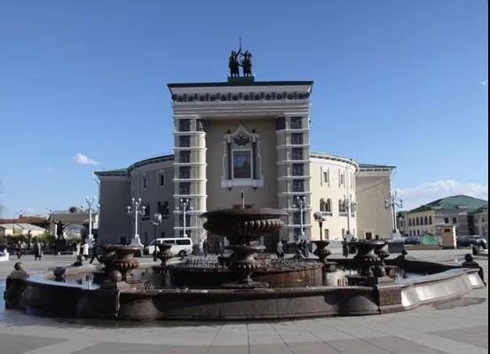 旁邊就是烏蘭烏德的民族劇院,黃色建筑的上方有戰(zhàn)馬嘶鳴的銅像。門口不遠處有展牌,上面是演出預(yù)告和海報。