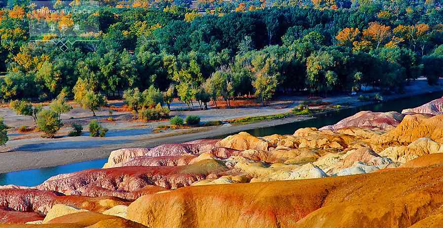 【五彩灘】(游覽時(shí)間60分鐘)五彩灘位于新疆北部,五彩灘又名五彩河岸,我國唯一的一條注入北冰洋的河流。五彩灘地貌特殊, 山勢起伏、顏色多變,其是由激猛的流河侵蝕切割以及狂風(fēng)侵蝕作用而共同形成。由于河岸巖層間抗風(fēng)化能力的強(qiáng)弱程度不一而形成了參差不齊的輪廓,這里的巖石顏色多變,且在陽光照射下,巖石的色彩以紅色為主,間以綠、紫、黃、白、黑及過渡色彩,色彩斑斕、嬌艷嫵媚,因此被稱作“五彩河岸”、是“新疆最美的雅丹地貌”。