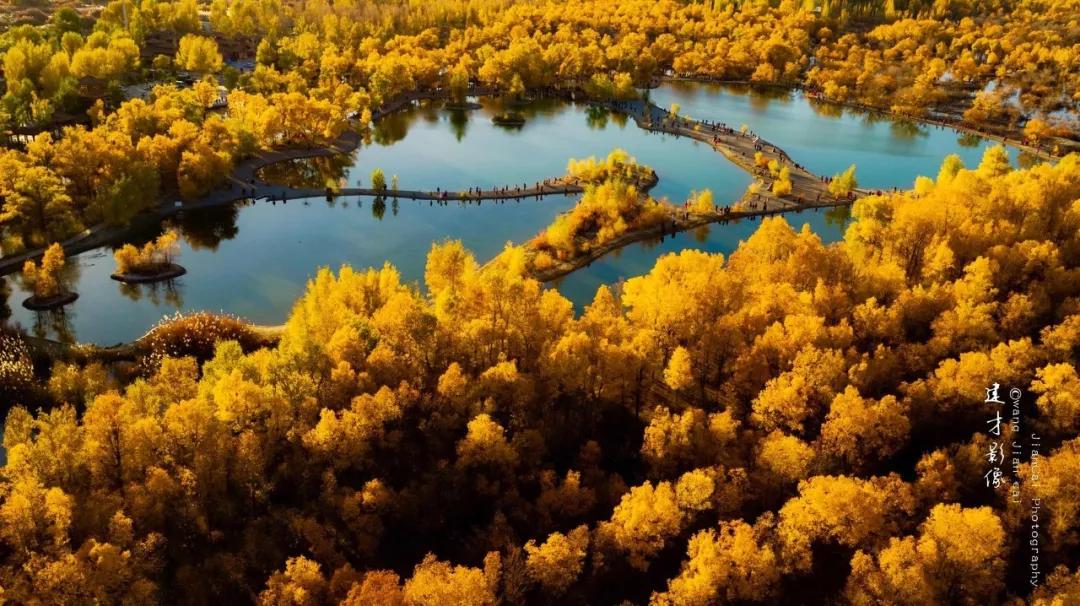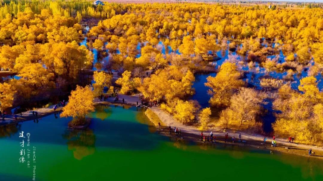 在甘肅省酒泉市金塔縣,八萬(wàn)多畝人工胡楊林化為一片金黃,在一池碧水的掩映下,如同一把把火炬,閃爍著耀眼的金光。