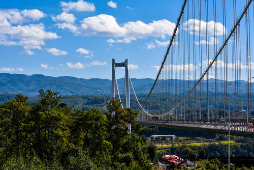 【龍江特大橋】亞洲最長的高速公路懸索橋——云南保山高速公路龍江特大橋,跨越龍陵縣龍江鄉(xiāng)上邦煥村與騰沖縣五合鄉(xiāng)大丙弄村之間的龍川江河谷,大橋全長2470.58米,保山岸索塔高度為169.688米,騰沖岸索塔高度為129.703米,橋面離江面280米,主跨長為1196米,成為目前亞洲最大的懸索橋;