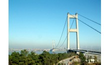江陰長江公路大橋,位于江蘇省江陰市黃田港以東3200米的西山,主跨1385米(328+1385+295),橋塔高190米,為兩根鋼筋混凝土空心塔柱與三道橫梁組成的門式框架結(jié)構(gòu),重力式錨碇,主梁采用流線型箱梁斷面,鋼箱梁全寬36.9米,梁高3米,橋面寬29.5米,雙向六車道,兩側(cè)各設(shè)寬1.8米的風(fēng)嘴,1999年建成。