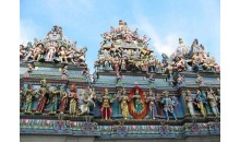 維拉瑪卡里雅曼興都廟(Sri Veeramakliaman Temple)建于1855年。特殊的彩繪門(mén)樓屬典型的南印度建筑風(fēng)格,門(mén)上高聳的塔樓上裝飾許多立體的彩色神像,廟里則是供奉主掌生死的"卡莉女神"(Kali)。雕刻在門(mén)樓上的印度教諸神與圣物牛、斗士等,在太陽(yáng)的照耀下閃閃發(fā)光,耀人眼目。寺廟周?chē)膲Ρ冢急煌砍杉t白色,極富喜慶氣氛。