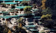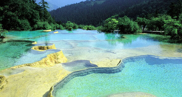 進(jìn)入黃龍景區(qū),首先看到的是一組精巧別致、水質(zhì)明麗的池群--迎賓池。池子大小不一,形狀奇特,色彩艷麗,錯落有致,四周山岳環(huán)峙,林木蔥蘢,山間野花競放,彩蝶飛舞。山間石徑曲折盤旋,點綴著觀景亭閣,倍添情趣。