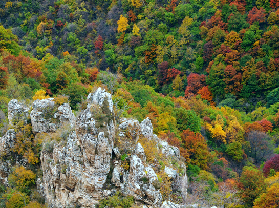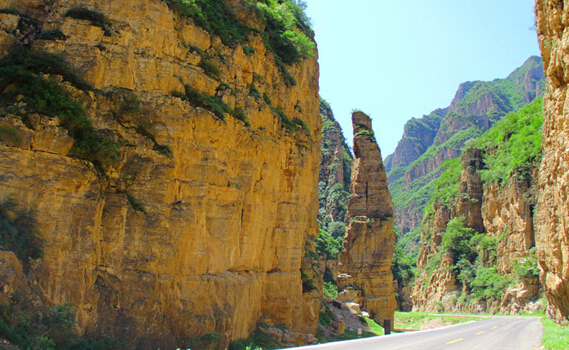 峽谷中,谷寬澗淺,如在盛夏時節(jié),陽光普照,滿山滴翠,空氣清新,鳥語花香。再往前行,只見峰巒閉鎖,兩壁怪石交錯,明媚的陽光已不復(fù)存在,冷風(fēng)習(xí)習(xí)、陰森逼人,只有一線天,亂云飛渡。順山路而進,時而陡壁迎面,山窮水盡;時而峰回路轉(zhuǎn),柳暗花明,別有洞天。當(dāng)?shù)匕傩罩v,四十里飛狐七十二道彎,彎彎有洞天美景,處處含勝景奇觀。峽谷一路前行,有“一炷香”、“雙箭孔”、“三仙思月”、“四將守門”、“五狗望月”、“六郎樁”、“七女峰”、“八仙洞”等奇峰異石,每一處奇觀都會給人留下無限遐想。四十里飛狐四十里景,迷宮奇物天作成。它以山峰怪異稱奇,以深幽兇險稱奇,自古多少兵家因此處山兇地險而爭戰(zhàn)駐守,多少文人墨客對奇景嘆妙稱奇留下詩篇。這里公路通達,車行順暢,更成為旅游觀光、尋覓歷史遺跡的絕好去處。