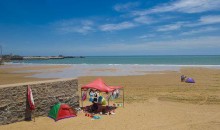 趕海撿貝園內(nèi)礁石密布,奇石林立,千姿百態(tài),物產(chǎn)豐富,有各種貝類、魚、蝦、蟹、海螺、海參、海菜等海產(chǎn)品,一年四季可趕海拾貝、挖蛤、垂釣。每天落朝時,海水退卻3公里左右,是趕海撿貝的好時機(jī)。夜晚沙灘篝火晚會,載歌載舞,更是令人情舒暢。