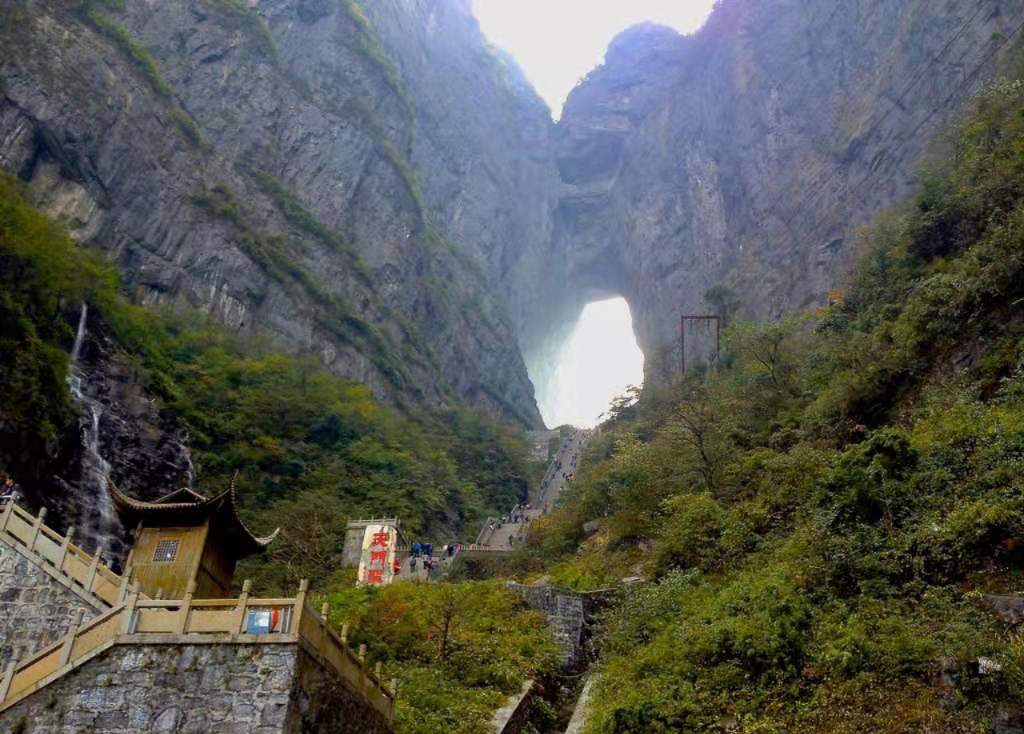 在古老的中國大地上,有一個人間通往仙界桃源的大山,武陵山脈之魂——天門山。您只要從天門山腳登上九百九十九級石階梯,就會到達通往仙界的大門——天門洞。版權所有山東聊城聊之旅國際旅行社有限公司,轉載必究!碩大的門洞足夠現(xiàn)代人駕駛飛機穿越而過,是世界上最高的天然溶洞,該天門洞形成的時間比唐僧取經(jīng)時收取的由石頭爆出的大徒弟孫悟空還早500余年(公元263年溶洞形成)。它是天門山中一塊大石塊由于吸聚天地之靈氣噴溥洞開而成。從此,凡人間偉大人物仙逝,該天門山上不管是晴空萬里還是滿天星斗,都瞬間電閃雷鳴,風雨交加,猶如天門洞落淚,傾盆而下……淚水沿著絕壁山崖瀑布而瀉,遠遠望去,似天上銀河下九洲。這現(xiàn)象至今仍無法開解!