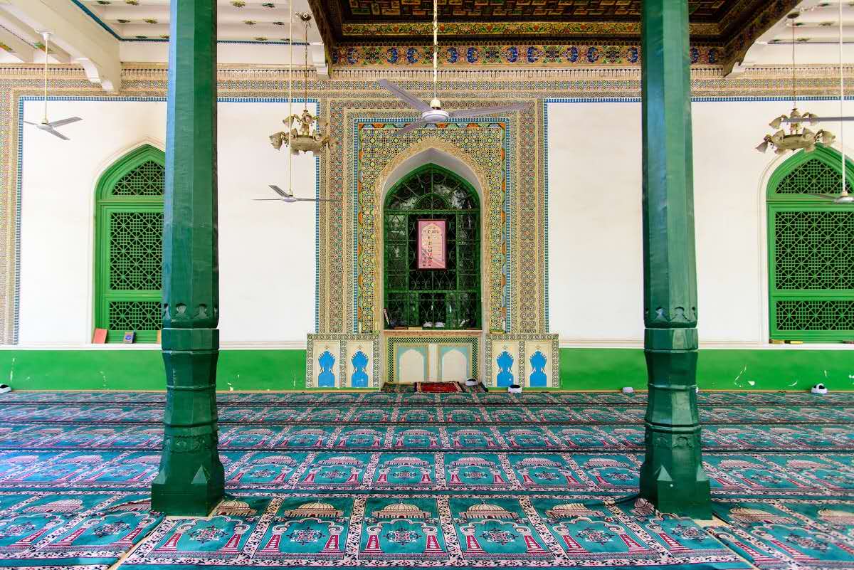 側(cè)門,也是平時(shí)供人們出入之用的。院落的后面有一排木柵欄,柵欄東側(cè),東西走向人行道的南北兩側(cè),有兩個(gè)宣禮塔。塔高6.5米,塔底為長(zhǎng)3米,寬2.2米。柵欄全長(zhǎng)115米,共有5個(gè)木門通向正殿,木柵欄高2.9米,立柱(磚砌)高3.1米,中門高4.1米,兩側(cè)立柱高5.2米。版權(quán)所有山東聊城聊之旅國(guó)際旅行社有限公司,轉(zhuǎn)載必究!從柵欄的五個(gè)門進(jìn)入禮拜殿,有五個(gè)臺(tái)階可以上到禮拜殿,禮拜殿分為正殿和外殿,長(zhǎng)140米,寬16米,加上向西突出的前廊部分,禮拜殿共2600平米,從中間的八級(jí)臺(tái)階可直上正殿的前廊。正殿長(zhǎng)36.5米,寬10.5米,高8.1米。寺內(nèi)平時(shí)有二、三千人做禮拜,“居瑪日”(星期五)有六七千人;逢節(jié)日時(shí)在寺內(nèi)外跪拜的穆斯林可達(dá)二三萬人之多。