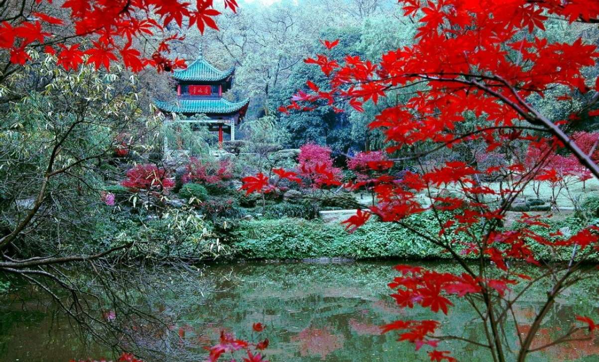 袁枚到了清風(fēng)峽,只見這里三面環(huán)山,楓葉紅的像火,中間開闊處有座亭子,石柱子,琉璃瓦,飛檐高挑。亭子的匾額上寫著“紅葉亭”三個大字,柱子上刻了一副對聯(lián):“山徑晚紅舒,五百夭桃新種得,峽云深滴翠,一雙馴鶴待籠來。”袁枚看了對聯(lián),不住點頭,望望匾額,好像想說什么,又沒說出口來。他離開了清風(fēng)峽,參拜了麓山寺,觀賞了白鶴泉,登上了 云麓宮,才興盡下山。