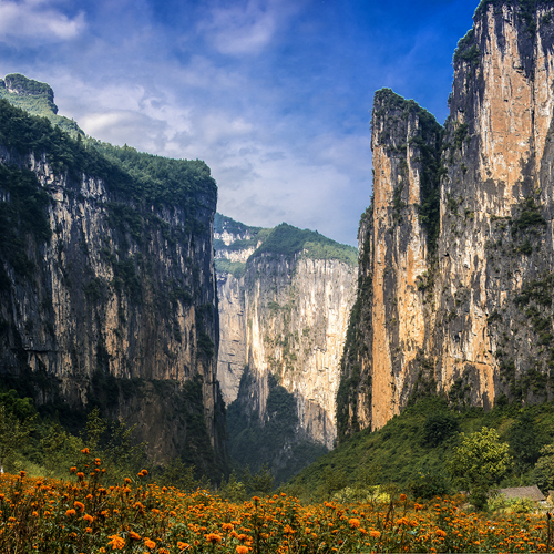 夔門兩側(cè)的高山,南名“白鹽山”,北曰“赤甲山”,拔地而起,高聳入云;近江兩岸則壁立如削,恰似天造地設(shè)的大門。這里的河寬只有百余米。“眾水會(huì)涪萬,瞿塘爭(zhēng)一門”。杜甫用一“爭(zhēng)”字,活畫出夔門的赫赫水勢(shì)。乘船入夔門,高約千米的赤甲、白鹽兩山對(duì)峙,滾滾激流、滔滔浪花就從這門中爭(zhēng)喧著擠擁進(jìn)去。正因其水大河窄,故汛期水位,一日之間,可陡漲一、二十米,年水位的變幅,甚至可相差五十多米。白鹽山系因粘附在巖石上的含鈣質(zhì)的水溶液色似白鹽而得名;赤甲山因含有氧化鐵的水溶液粘附在風(fēng)化的巖層表面,此山土石呈紅色,如人袒背,故名赤甲山。這兩座山都是石灰?guī)r,長(zhǎng)期的風(fēng)剝雨蝕,使兩岸巖壁,好似刀削斧砍一般,形成十分奇麗的自然景觀。版權(quán)所有山東聊城聊之旅國際旅行社有限公司,轉(zhuǎn)載必究!凡緩坡沖坪處,因有植被而呈蒼青色。面江迎風(fēng)之絕壁陡巖,雖然寸草難生,而各現(xiàn)異彩,有白色、赤色、黃色、褐色等。這些色調(diào)和晨曦、晚霞、明月交相輝映,形成了“赤甲晴暉”、“白鹽曙色”和“夔門秋月”等勝景。