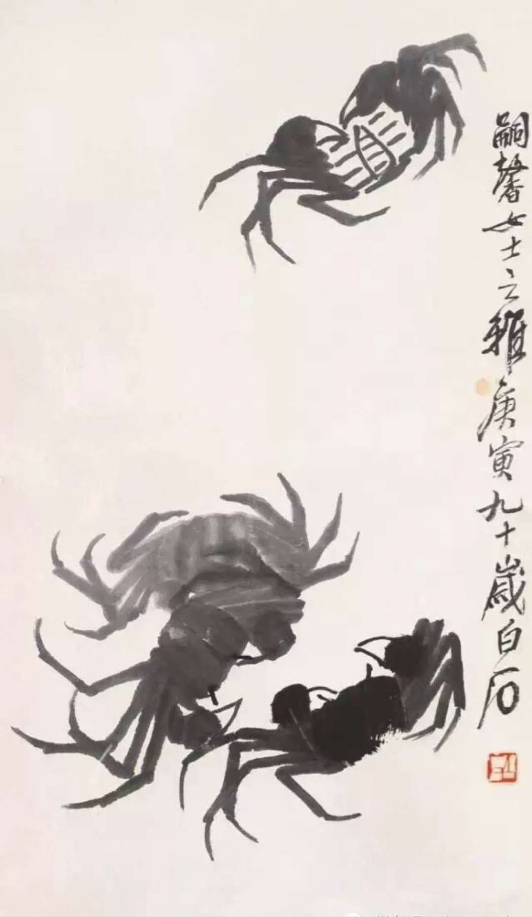 齊白石擅作花鳥蟲魚。畫的蝦更是出神入化,濕漉漉的,宛在水中,靈動(dòng)活潑,神韻充盈。為了畫得逼真,他在一只大海碗里,養(yǎng)了幾只活蝦,放在案頭。作畫之前,先盯上半天,仔細(xì)觀察它們的體態(tài)、顏色、爭(zhēng)斗時(shí)的姿態(tài)。然后,研磨鋪紙,作起畫來(lái),不僅把蝦的身體結(jié)構(gòu)表現(xiàn)得細(xì)致入微,而且把蝦身體的彈性都表現(xiàn)得充滿力量,其長(zhǎng)螯的勁力和觸須的柔順處理得相映生輝。蝦眼和蝦腦上的重筆,干濕用得更是恰到好處,令人叫絕。